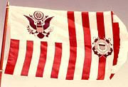 Some say the correct size ratio is 1 x 1.9 A 1913 Postcard has a civil flag flying on the Customs House in San Francisco Click on picture to enlarge Another example of the vertical stripes: "The Coast Guard Ensign (flag) was first flown by the Revenue Cutter Service in 1799 to distinguish revenue cutters from merchant ships." --Wikipedia This flag was a symbol of law enforcement authority, not Military authority. | The flag shown above appears to be a "USA flag" but has one or more of the following: